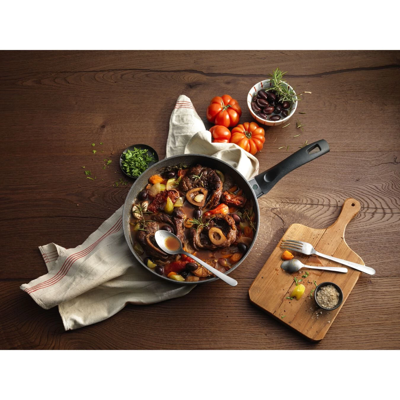 En la sartén de la serie Ferrara Granitium de BALLARINI preparará en un abrir y cerrar de ojos comidas apetitosas y saludables. El resistente revestimiento antiadherente GRANITIUM está formado por 5 capas y se ha reforzado con partículas minerales para garantizar que los alimentos no se peguen ni se quemen. Utilizar una espátula y otros accesorios de metal no es un inconveniente, ya que, gracias a las partículas de cerámica, la superficie interior de la sartén es muy resistente a las rayaduras. Además, permite cocinar con muy poca cantidad de aceite o grasas, ideal para una alimentación saludable.