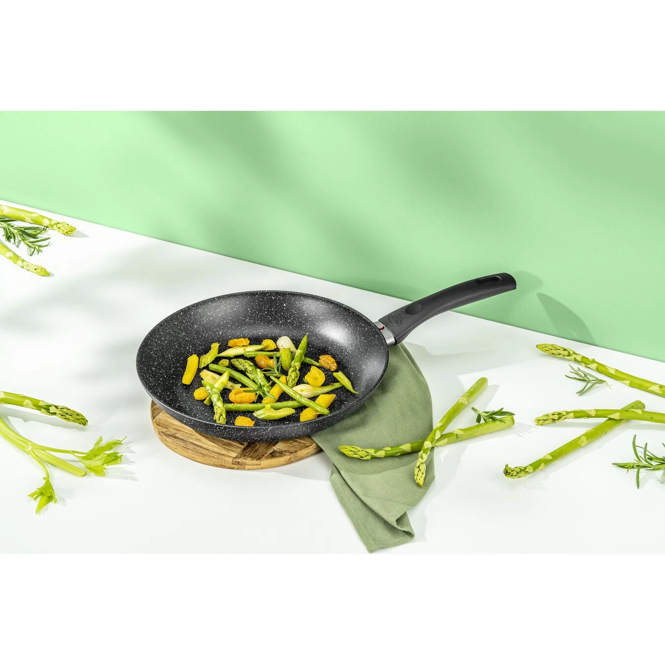 La sartén BALLARINI Vipiteno con un diámetro de 28 cm impresiona por sus buenas propiedades de cocción y su innovador indicador de frío/calor THERMOTION. Esto le muestra de un vistazo cuando la sartén está lo suficientemente caliente. Luego, el indicador sube y lo ayuda a encontrar la temperatura de cocción ideal. También puede regular el suministro de calor desde el principio y así ahorrar mucha energía. Si la sartén universal vuelve a enfriarse después de su uso, el indicador se apaga. Ahora puede tocar y lavar con seguridad la bandeja de aluminio. Otro punto a destacar es el revestimiento. El revestimiento antiadherente Nerolite es muy resistente a los arañazos y duradero. Para que puedas disfrutar durante mucho tiempo de tu sartén BALLARINI Vipiteno. La base con tecnología de inducción Radiant es igual de ventajoso. Puede distribuir el calor rápida y uniformemente; también puedes usarlo con inducción. Para un trabajo cómodo, la sartén tiene un mango de plástico ergonómico que siempre es cómodo de sostener y se mantiene agradablemente fresco.