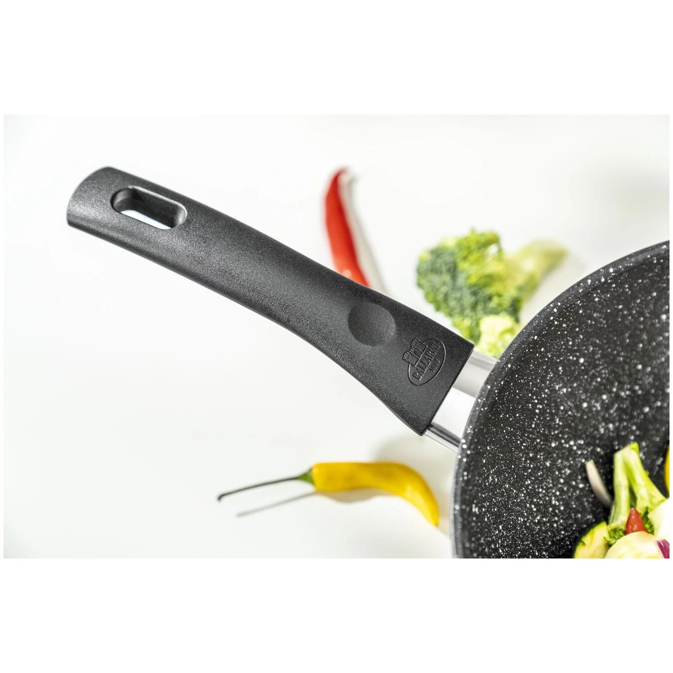 Algo nuevo para sus platos de wok: ¡El wok BALLARINI Vipiteno con un diámetro de 28 cm viene con el innovador revestimiento antiadherente Nerolite! Gracias a este recubrimiento, la comida no se quemará tan rápido. Para freír alimentos sin preocupaciones y, si es necesario, añadir líquidos después. El revestimiento antiadherente permite una preparación con bajo contenido de aceite, es muy resistente a los arañazos y fácil de limpiar después de la cocción. La base de aluminio con tecnología de inducción Radiant patentada brinda aún más comodidad al cocinar: la base con una muy buena conducción del calor, también es apta para inducción. Para un manejo superior, los utensilios de cocina de aluminio tienen un mango de plástico ergonómico que es cómodo de sostener y se mantiene agradablemente fresco.