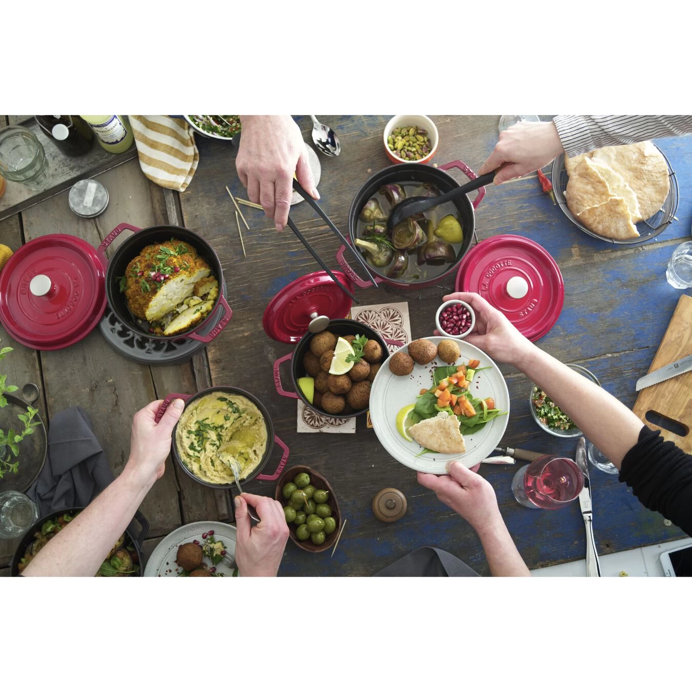 En la Cocotte redonda color rojo cereza de STAUB preparará los guisos más deliciosos, como el pollo al vino, con estilo. Este tipo especial de cazuela proviene de Francia, donde tiene una larga tradición. Incluso los mejores chefs usan las Cocottes para sus nuevas creaciones culinarias.