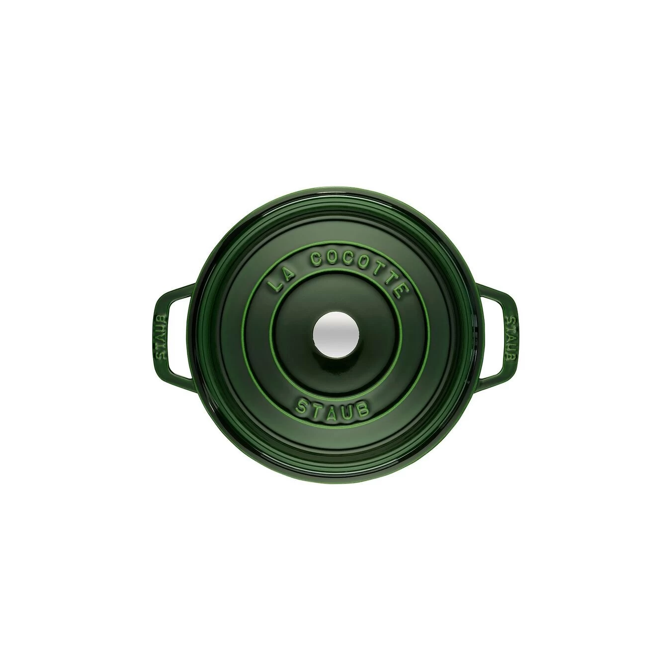 La Cocotte Staub de color verde albahaca dará un toque de color a su cocina. La Cocotte está indicada para múltiples guisos y potajes y esta redonda seguro que le servirá de inspiración. Su fabricación se ha centrado en aunar un diseño simple con una elevada funcionalidad. Con un diámetro de 24 cm, una capacidad de 3,8 l. y 25 cm de alto, esta Cocotte es ideal para el hogar.