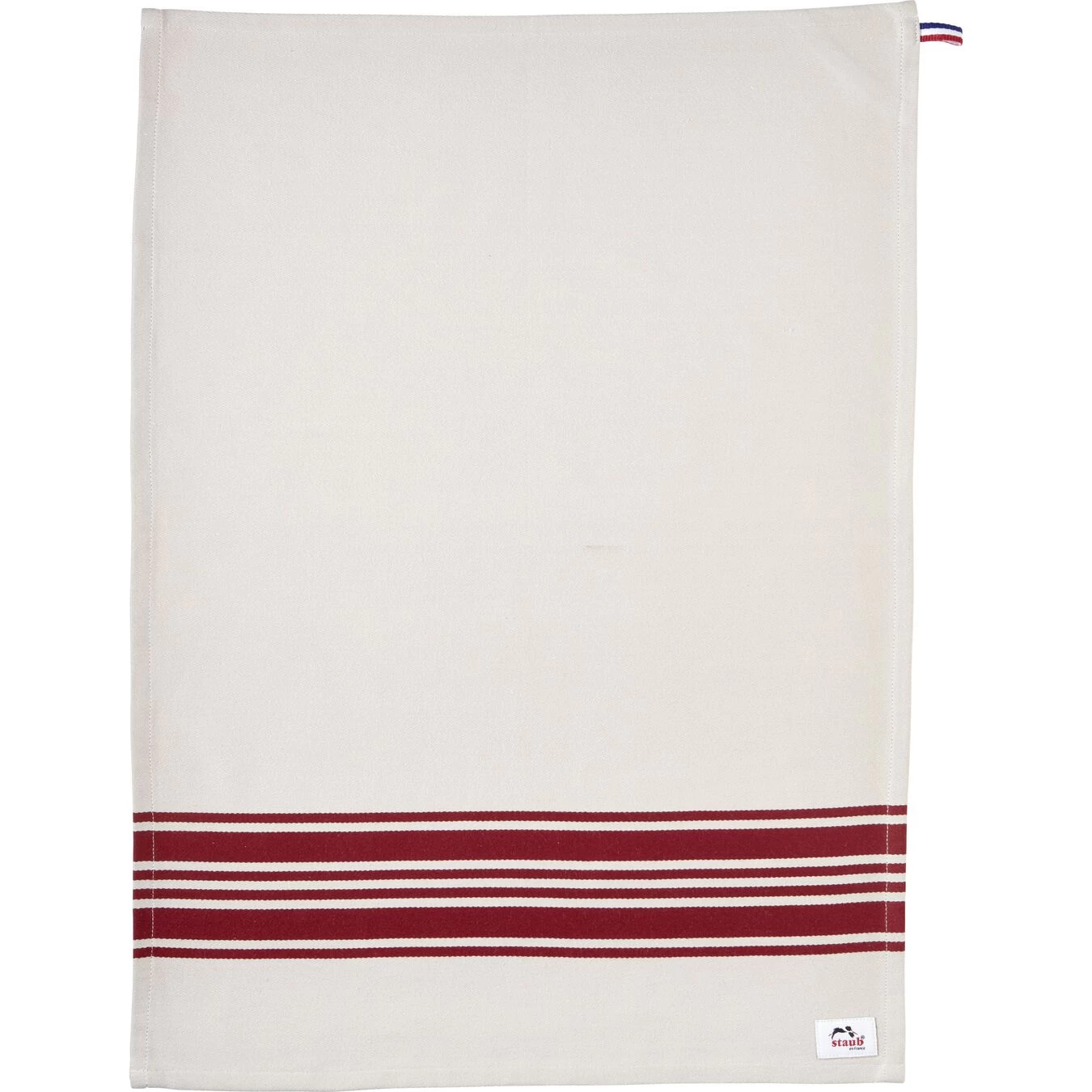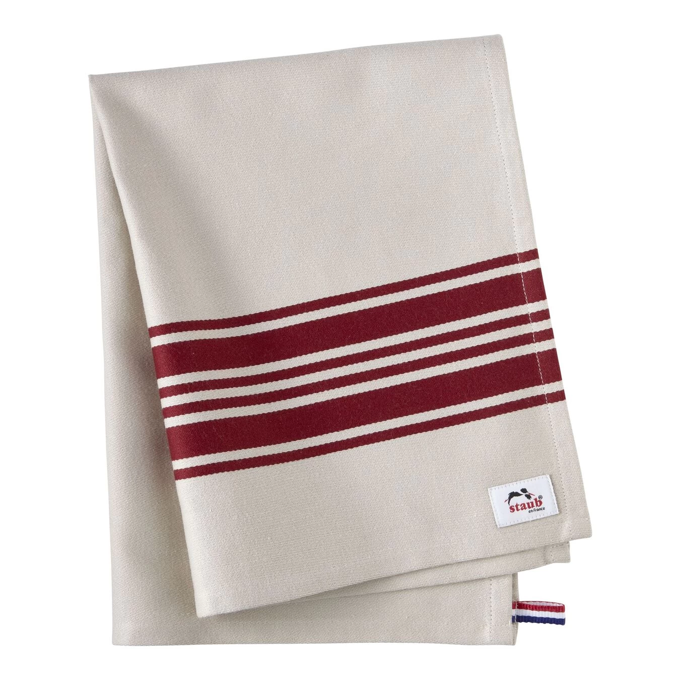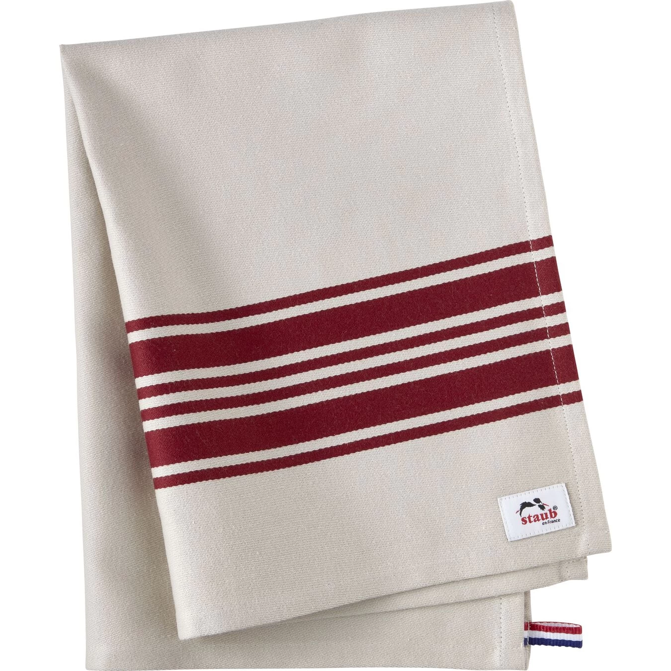Diseño práctico, de alta calidad y elegante: el nuevo paño de cocina STAUB cumple con todos los criterios para ser un gran acompañante en la cocina. Calidad garantizada por un tejido de 100% algodón con alta absorbencia, costuras cosidas en los cuatro lados y una percha firmemente cosida. Con unas dimensiones de 50 x 70 cm, el paño de cocina es ideal para todas las tareas y es un ayudante indispensable. Además de la función, la apariencia visual juega un papel importante en cada cocina sofisticada. En consecuencia, el diseño atemporal con rayas rojas en la tela blanca natural es un elemento decorativo y elegante. Aún más hermosos son los detalles de la etiqueta con el logotipo de STAUB y la pequeña bandera francesa con los tres colores.