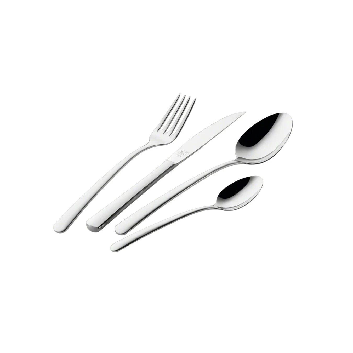 Esta cubertería de 113 piezas de la serie Nova está hecha en moldes obteniendo así una resistencia óptima a dobladuras. Tanto para pequeñas celebraciones o comidas familiares hasta 12 comensales es ideal para su mesa con su diseño moderno y elegante a la vez.