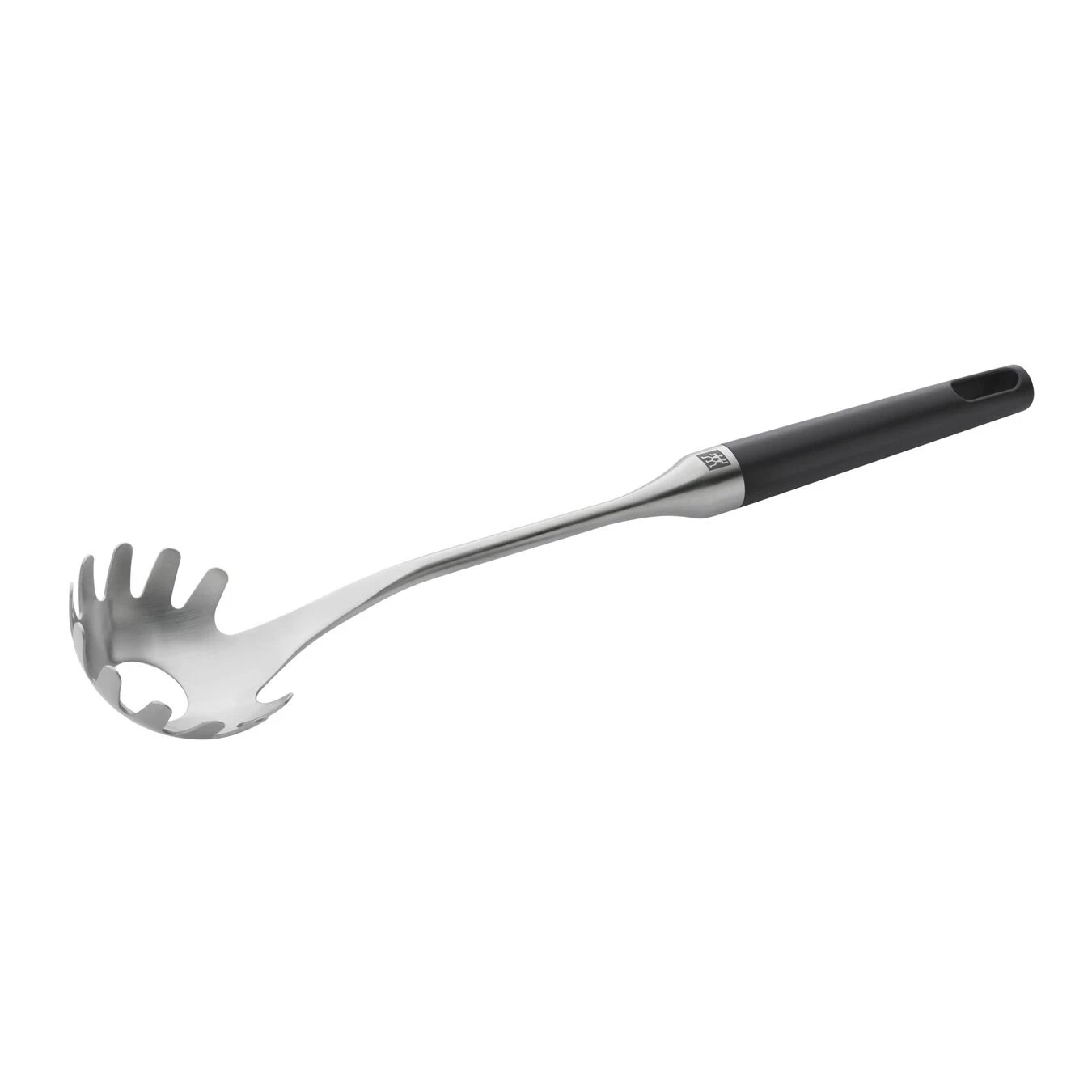 La superficie antideslizante permite un agarre firme. Este utensilio puede colgarse a un riel por el orificio que tiene en el mango. Así se ahorra espacio al tiempo que se mantiene al alcance de la mano. Emplee esta cuchada de spaghetti para servir con elegancia pasta y fideos.