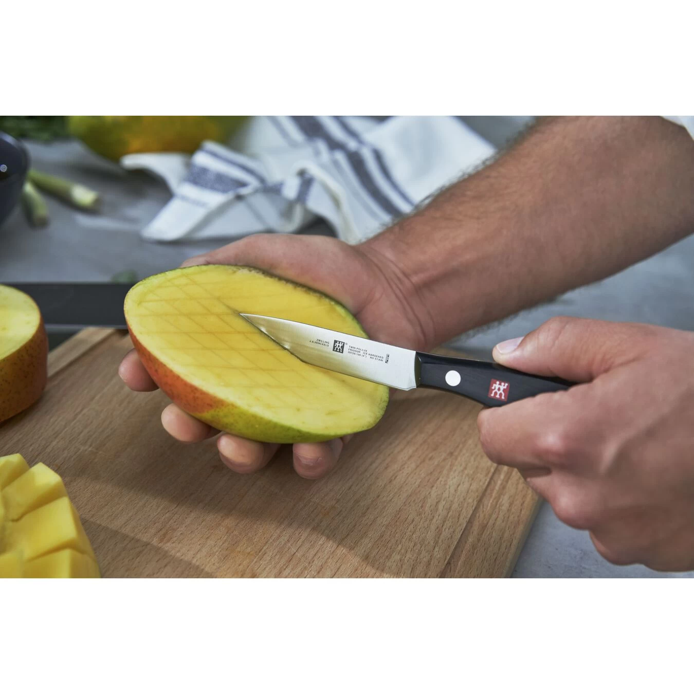 La precisión que puede alcanzarse con la puntilla la hace idónea para preparar frutas y verduras; trocear y pelar son sólo algunas de las tareas para las que este versátil, delgado y puntiagudo cuchillo puede usarse. El mango ergonómico de color negro está fabricado con plástico de gran calidad, muy cómodo de sujetar. El diseño inconfundible de tres remaches confiere a este práctico cuchillo una apariencia más elegante, si cabe. Con la puntilla ZWILLING se elaboran delicados platos en un instante.