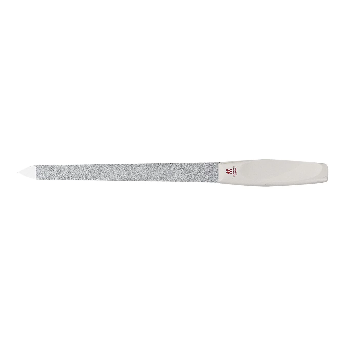 La lima zafiro de la serie de instrumentos ZWILLING® Classic ofrece una manicura impecable. Está formada por una lámina de acero acabada en punta con un recubrimiento de polvo abrasivo, firmemente unida a un mango de plástico de color blanco.