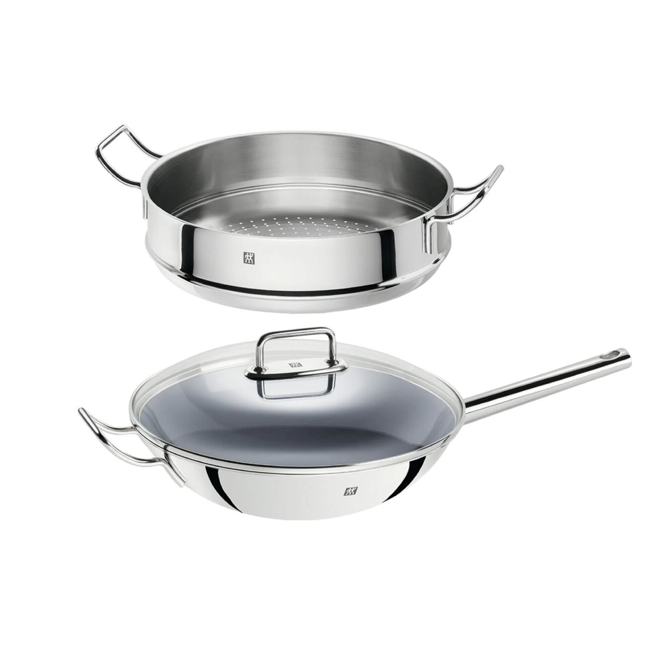 El wok de la serie ZWILLING® Plus tiene un revestimiento cerámico para evitar que se peguen los alimentos y es ideal para saltear o remover los platos que vaya preparando. La base multicapa está formada por aluminio encapsulado entre dos capas de acero inoxidable, lo que hace que la distribución del calor sea óptima. El wok mide 32 cm de diámetro y es apto para todo tipo de cocinas.