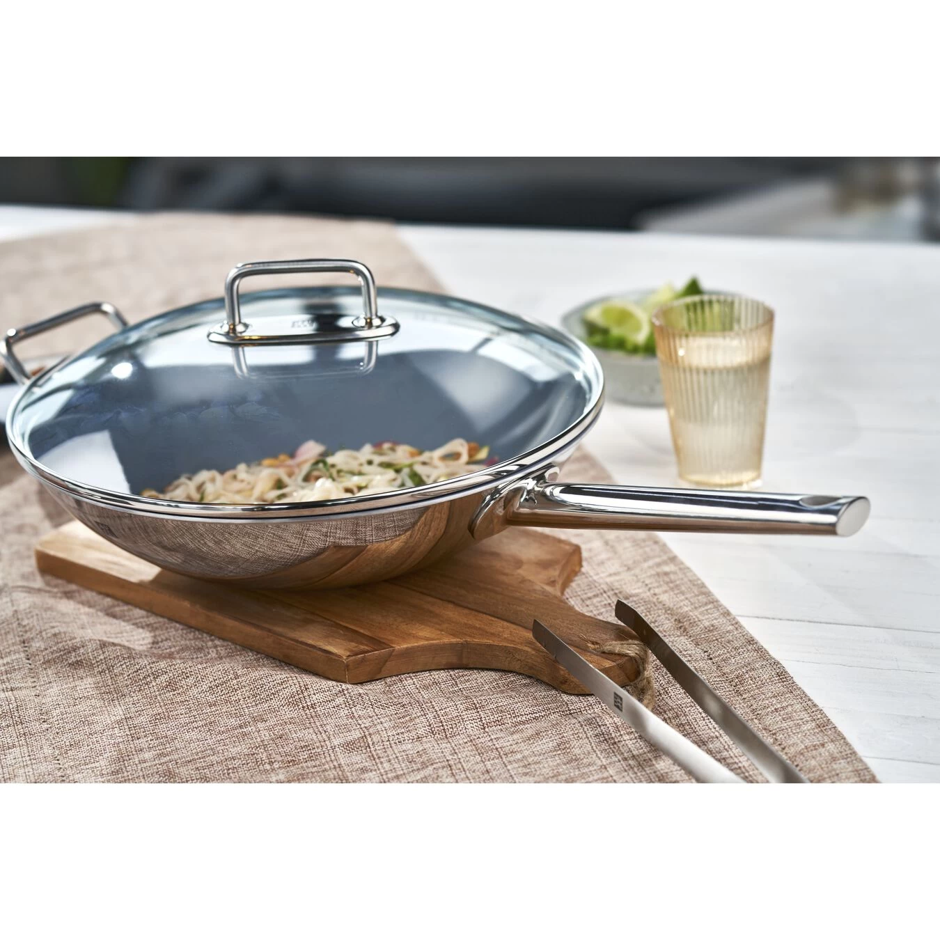 El wok con recubrimiento cerámico de la serie ZWILLING Plus es ideal para saltear, cuando es necesario remover constantemente la carne, las verduras y otros ingredientes. El revestimiento cerámico antiadherente CERAFORCEULTRA evita que la comida se adhiera y es además resistente a las rayaduras. Incluso los cocineros noveles podrán realizar en este wok deliciosos platos orientales. Es una opción muy saludable ya que necesita poco tiempo de cocción.